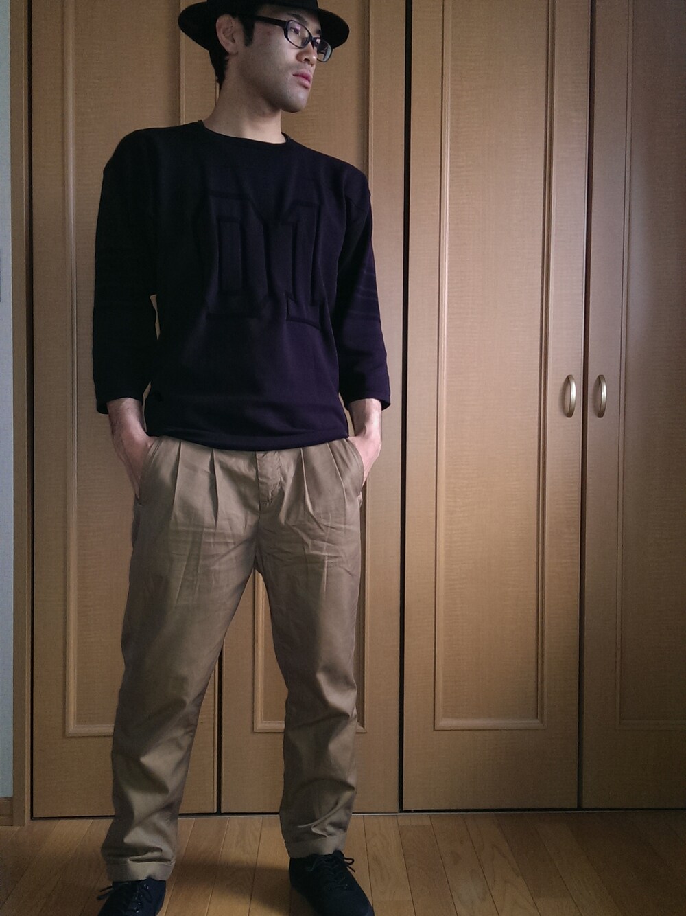 Episode no.,1のニットを使って、だいぶ暖かくなったことを想定したかたちで着てみました。 本当は、シャツなどを入れたスタイルも考えましたが、シンプルにいこうと思いこのようなかたちになりました。 それにしても、今日は寒い…。 まだ、この格好ができるのは先になりそうです(笑)