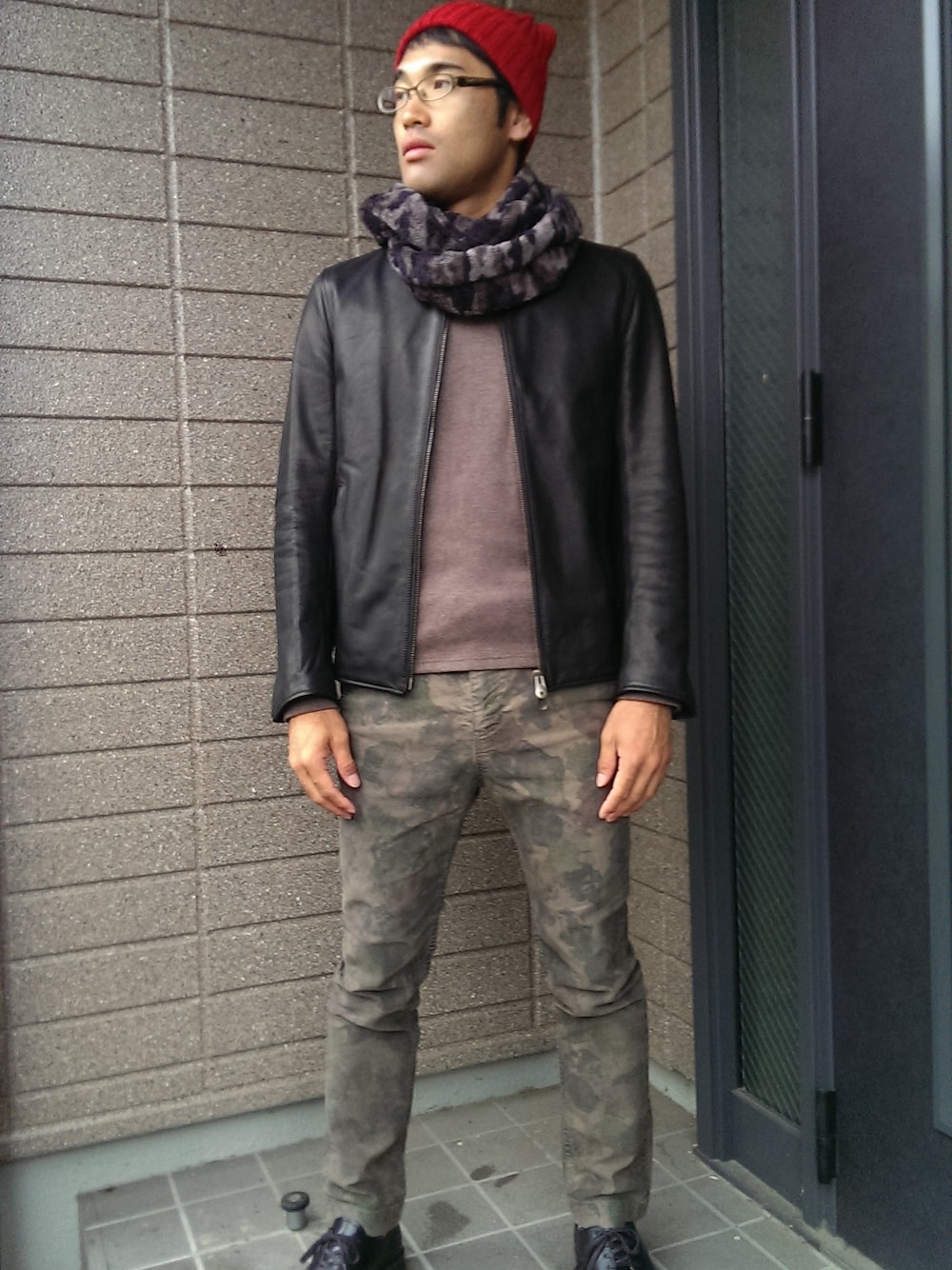 今日は雨が降っているのでMR.OLIVE E.O.Iのレザージャケットとポストマンブーツをチョイス。どちらも撥水加工がされているから雨に濡れても気にせずに使えるのですごくありがたい♪ ジャケットは質感と程よい重さが男心をくすぐります。 ポストマンブーツはソールが分厚く踏み込んだ時の足への負担が少ない作りになっていて、長時間歩いても痛くならないとこが個人的にgood。 泥臭い感じを出したかったのでなるべく黒と茶で色をまとめ、暗くなり過ぎないように赤いニット帽で明るさを加えてみました。