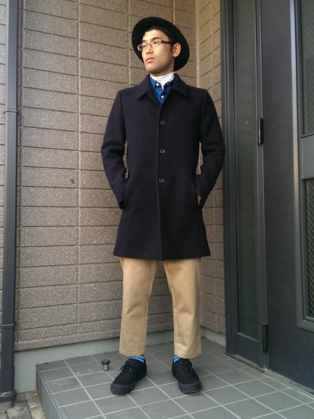 KUROのステンカラーコートを購入したので、BYKUROのシャツとチノパンを合わせてみました。 このステンカラーコート、ハンガーに掛けていてもすごくシルエットが美しいんです。 マネージャーの方に聞いた話では、テーラーの方が来店した際に、絶賛していたとかしてないとか。 昨年、BYKUROから出ていた時に買い損ない、くやしい思いをしたので、一年越しに手に入れることができて満足♪ コートのNAVYと、シャツのブルーをソックスで色合わせしつつ、ブラックのハットとシューズで引き締める感じに。 カチカチに見えないようにシューズはスニーカーにして、クロップドチノパンツで程よくリラックスした感じに見えるようにしてみました。