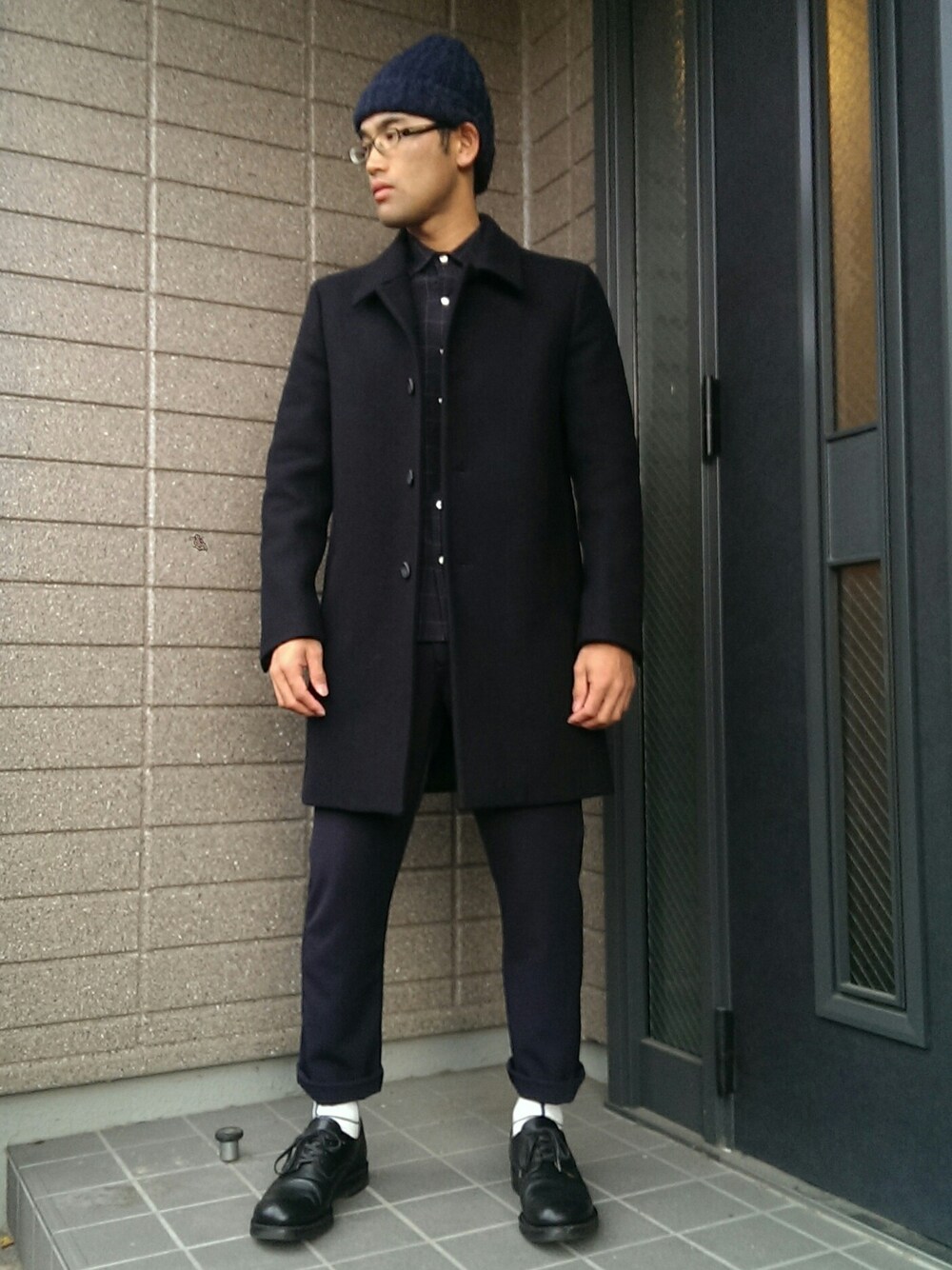 前回載せたステンカラーコートを使った別コーデ。 LAMONDの15AW新作アイテムから、ジャージー素材のすっきりとしたパンツを持ってきて、全体を紺と黒で落ち着いた感じに。 シャツとソックスはそれぞれ色違いでウィンドウペンチェック合わせにしてます。 見づらいけども(笑)