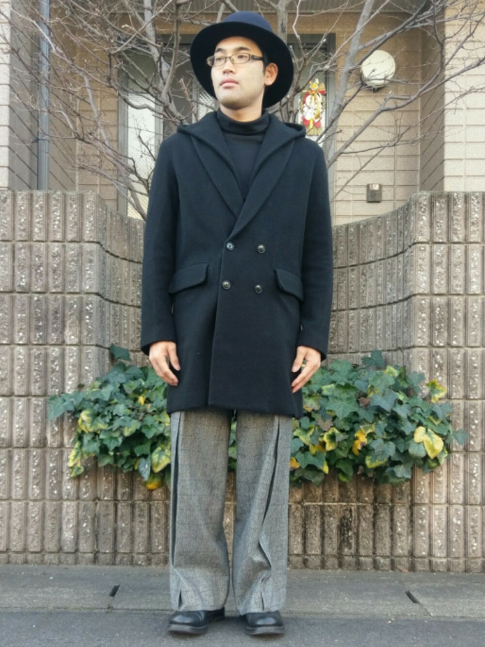いつもいいね、SAVE、コメントありがとうございます♪ 今日は、地元のセレクトショップsynapseの年始セールで買ったものでコーデを。 古着屋で買ったグレンチェックのワイドスラックスをメインに、MR.OLIVEのポストマンブーツ、トップスとアウターはシンプルにブラックで統一しました。 セールアイテムはチェスターコートとハット、タートルネックカットソーの三つ。 ボーラー型のハットを初めて買いましたが、丸っこいかたちが可愛いですね♪ チェスターコートはフードが取り外せる2way使用。こいつがなかなか便利で、軽く暖かくてとても気に入っています。