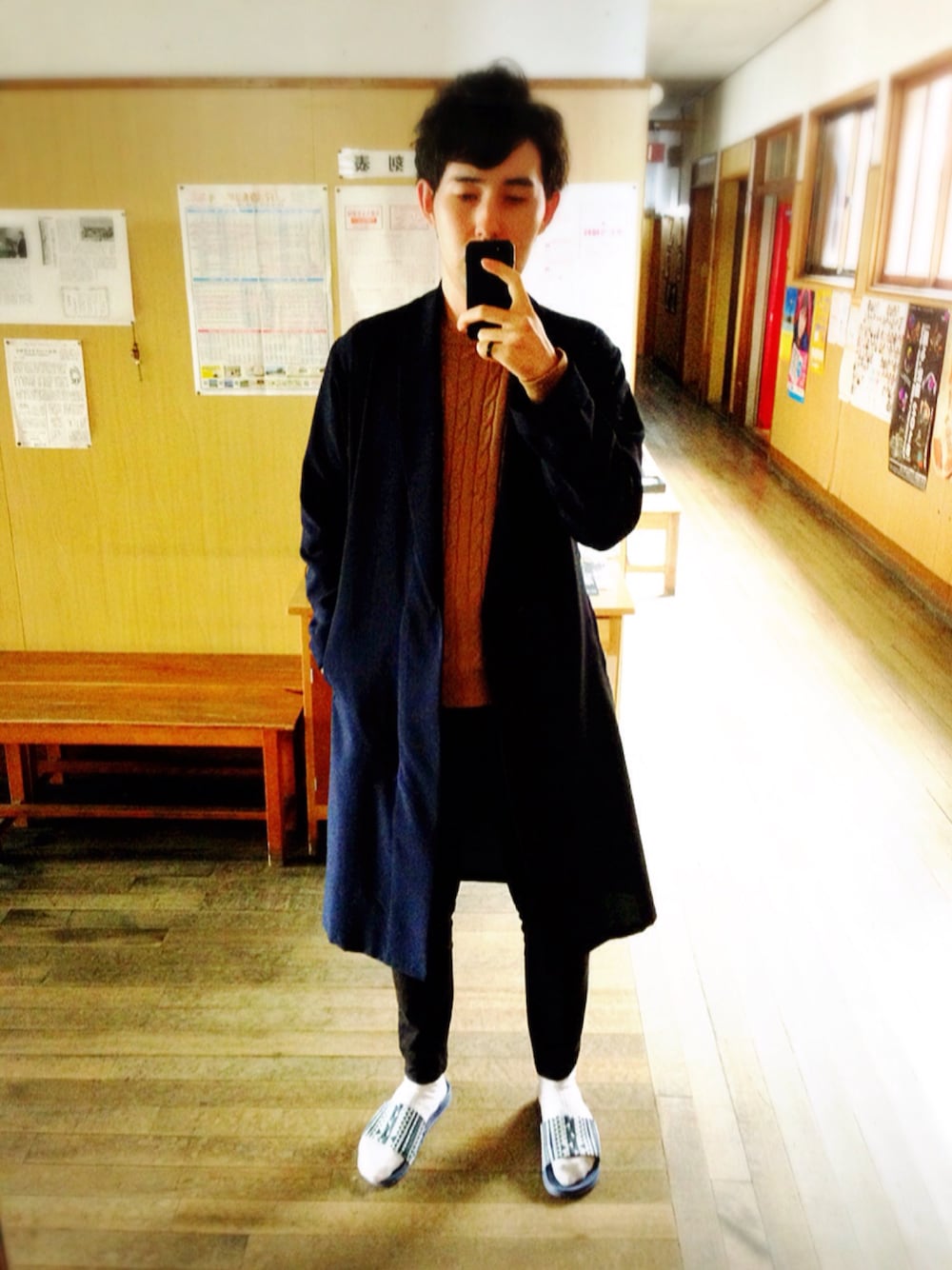 今日のコーディネート☆ ロングコート×スキニーで上品なVラインコーデを狙って。 このショールカラーコートは昨年買ったものですが、 ヒラリと舞うマントのようにビッグシルエットで、 風にふわりとなびく感じがオシャレ。 ワンボタンでダブルブレストっぽくなっているのもポイントの一つ。 開け閉めで楽しめる一着です☆ ワントーンじゃつまらないから、 挿し色にキャメルのクルーネックケーブルニットを入れて。 上品さを更にプラスしました! ブラックのスキニーとも相性いいですしね♪♪ 今日はスニーカーでハズしを演出しましたが、 かっちり革靴でもいいスタイルです!
