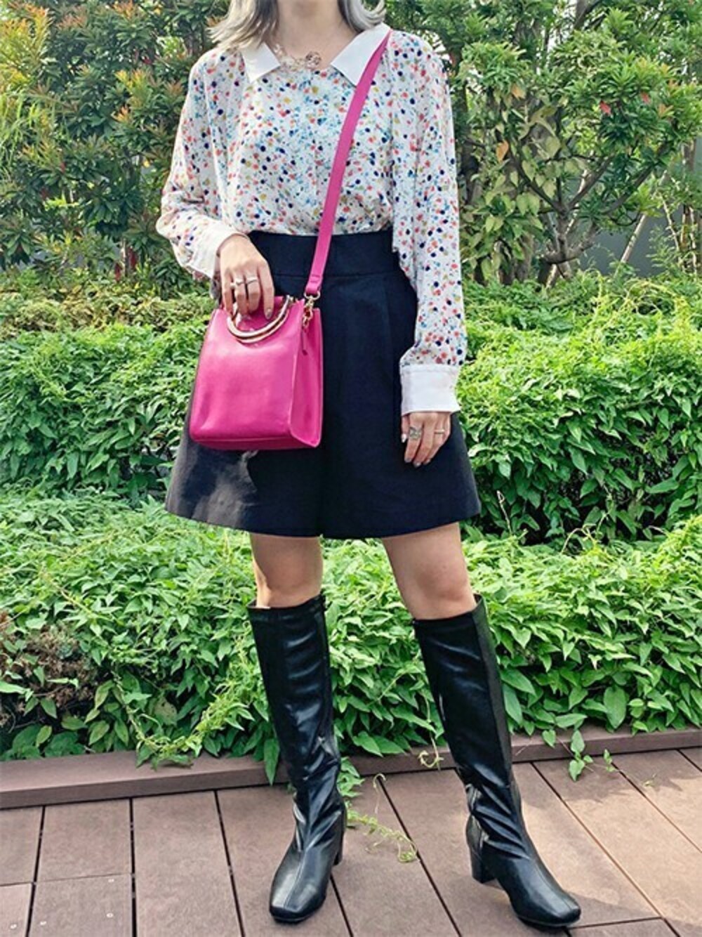 ショートパンツとロングブーツで 今期らしいスタイリング! ブラウスの花柄から色を拾って レザーバッグはピンクをセレクト!