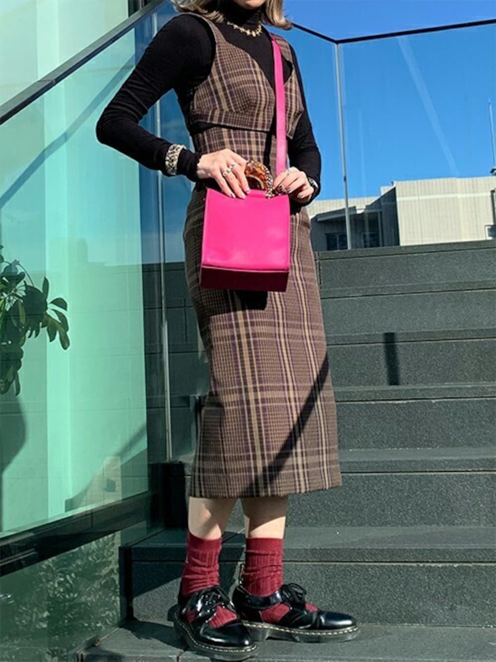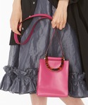 落ち着いたトーンのコーデに ピンクのレザーバッグをアクセントに! 暗い色が多くなりがちな これからの時期にも、 バッグなど小物で差し色をプラス!