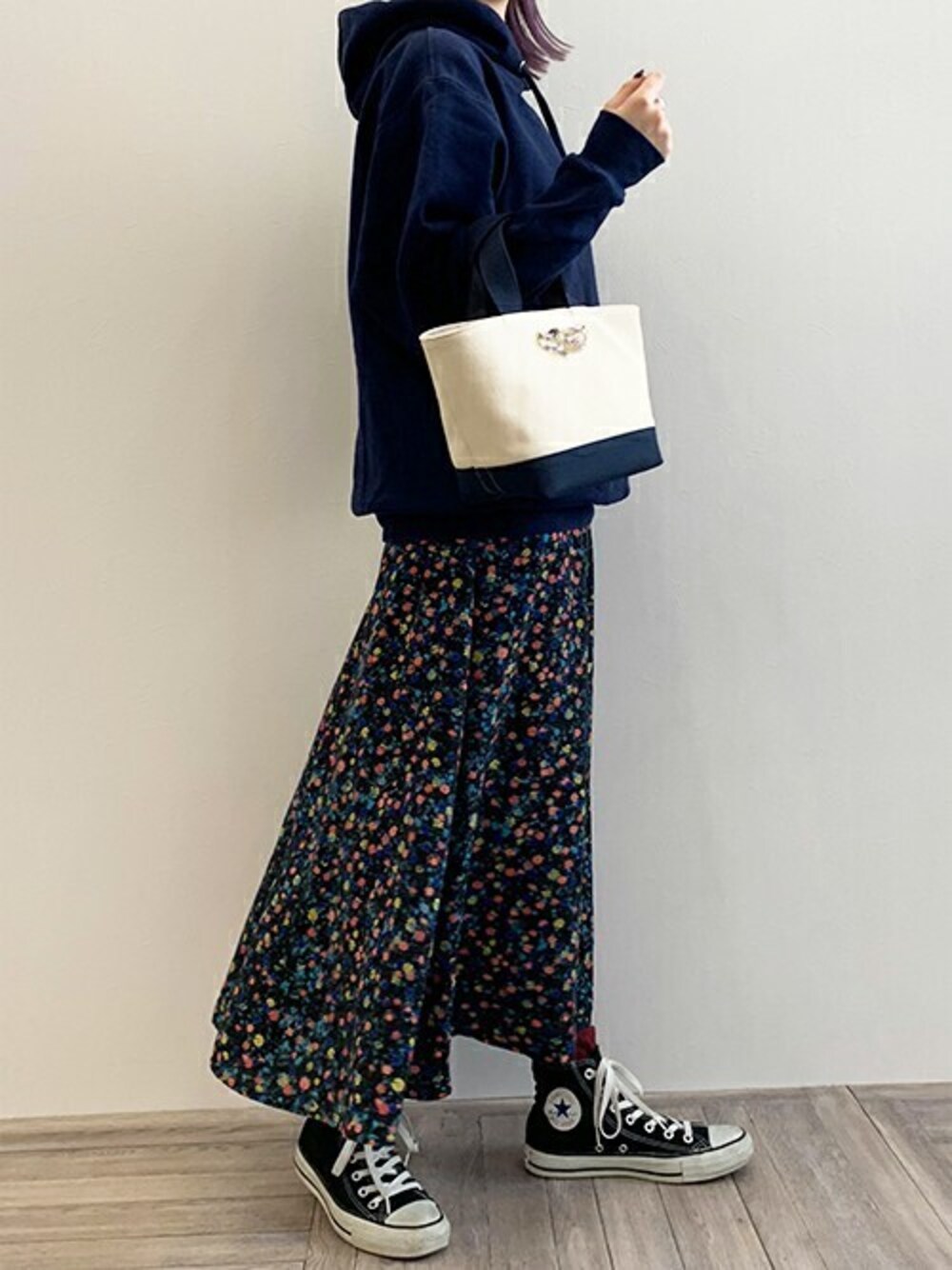 パーカーに花柄スカート、 キャンバスミニトートをあわせた 大人カジュアルなコーディネート。 スカートはウエストゴムで シワにもなりにくいので リラックス気分で着用頂けます! ブラウスやニットと合わせてきれいめにも。 バッグはお花入りビーズの飾りがアクセント!