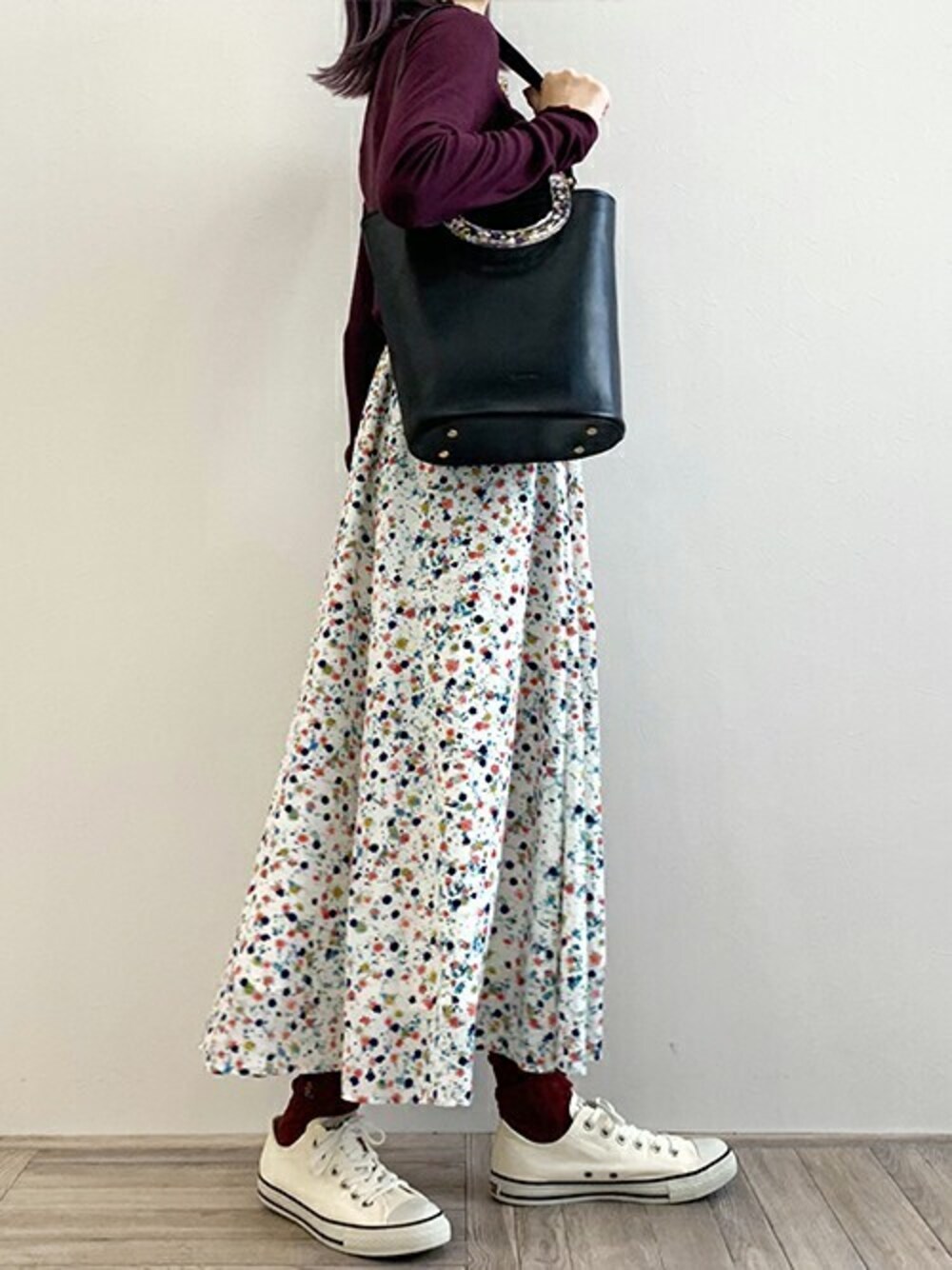 花柄フレアスカートと リブトップスをあわせた シンプルきれいめコーディネートです。 レザーバッグはブラックで締めて ホワイトのスニーカーで バランスを取りました!