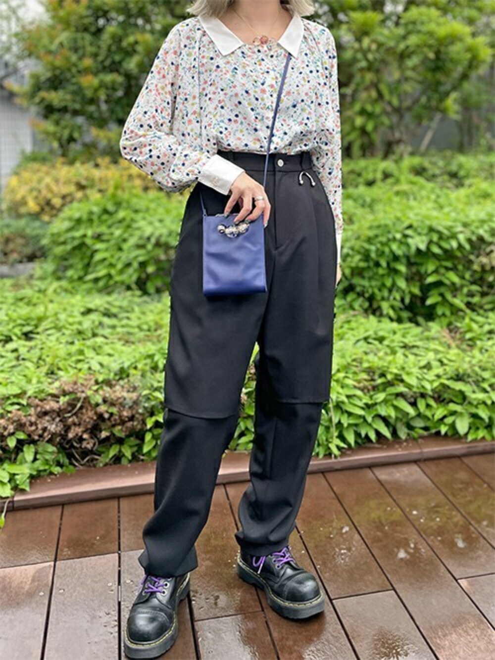 フェミニンな花柄ブラウスを、 黒のパンツとあわせました! ブラウスのお花の色を拾って、 レザーミニショルダーは ブルーを選んでポイントに◎
