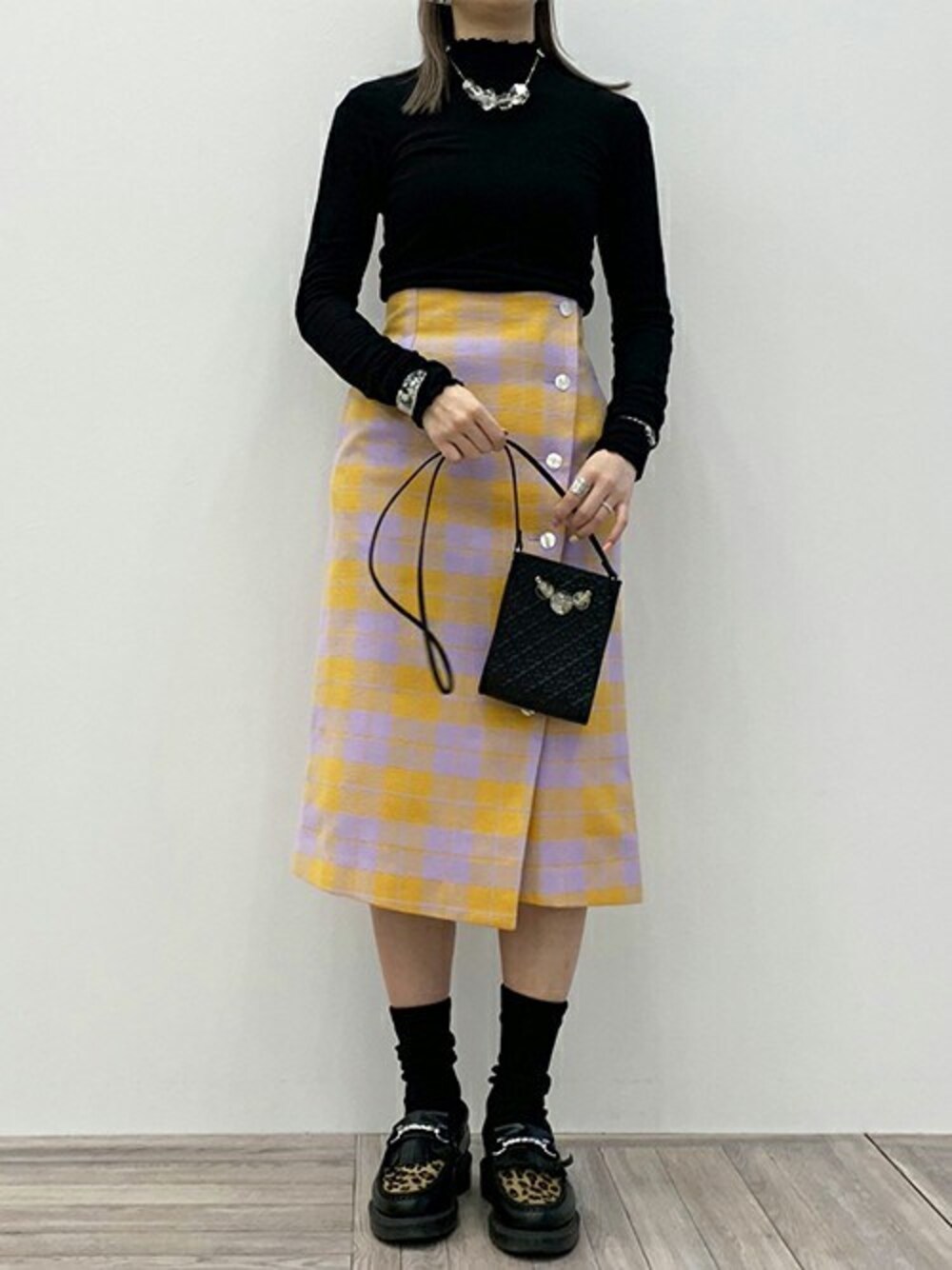 アクセサリーを新色の白いお花を使ったアクリルで揃えました! バッグはブラックを選んでバランスを取りました。 どんなスタイルにもスッとなじむアイテムです。