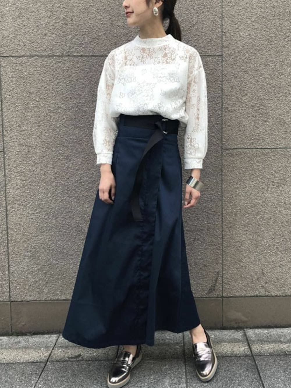 透け感のあるレース素材は今の季節に使いやすいアイテム ハイウエストでスタイルアップとネイビーで大人っぽく。
