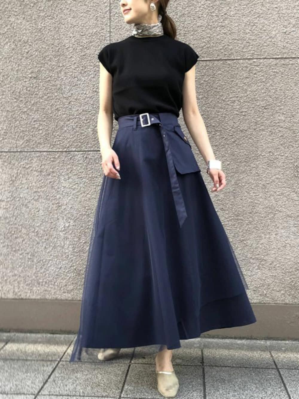 スカーフを巻いて今年っぽいスタイリングに。 チュールレイヤードスカートは高級感のある仕上がりです。