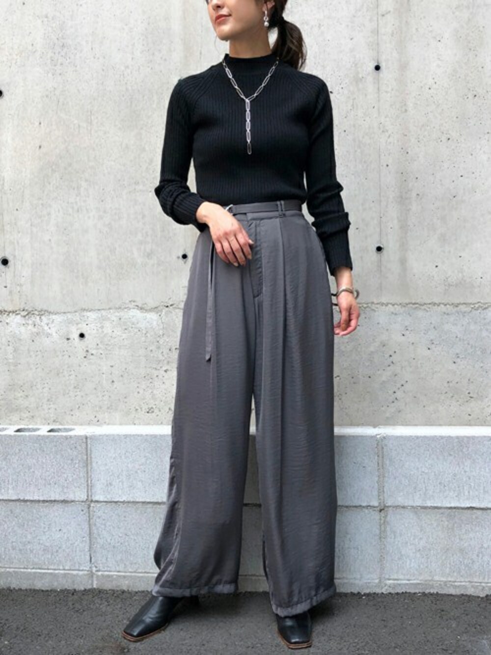 今からベストなコーディネート! 肌ざわりの良いリブニット。 ジャケットやコートのインナーにも最適です。 きれいめのマットサテンパンツ。 パンツはバックゴムになっている為 履き心地も抜群◎