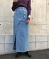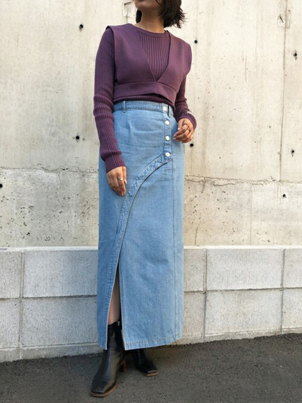 Iラインシルエットが大人な印象のデニムスカート スッキリとしたシルエットでデザインスカートを大人な印象で仕上げました。 落ち着いたカラーを選びがちな秋冬ですが明るめブルーデニムやパープルニットは 取り入れやすいカラーです。