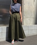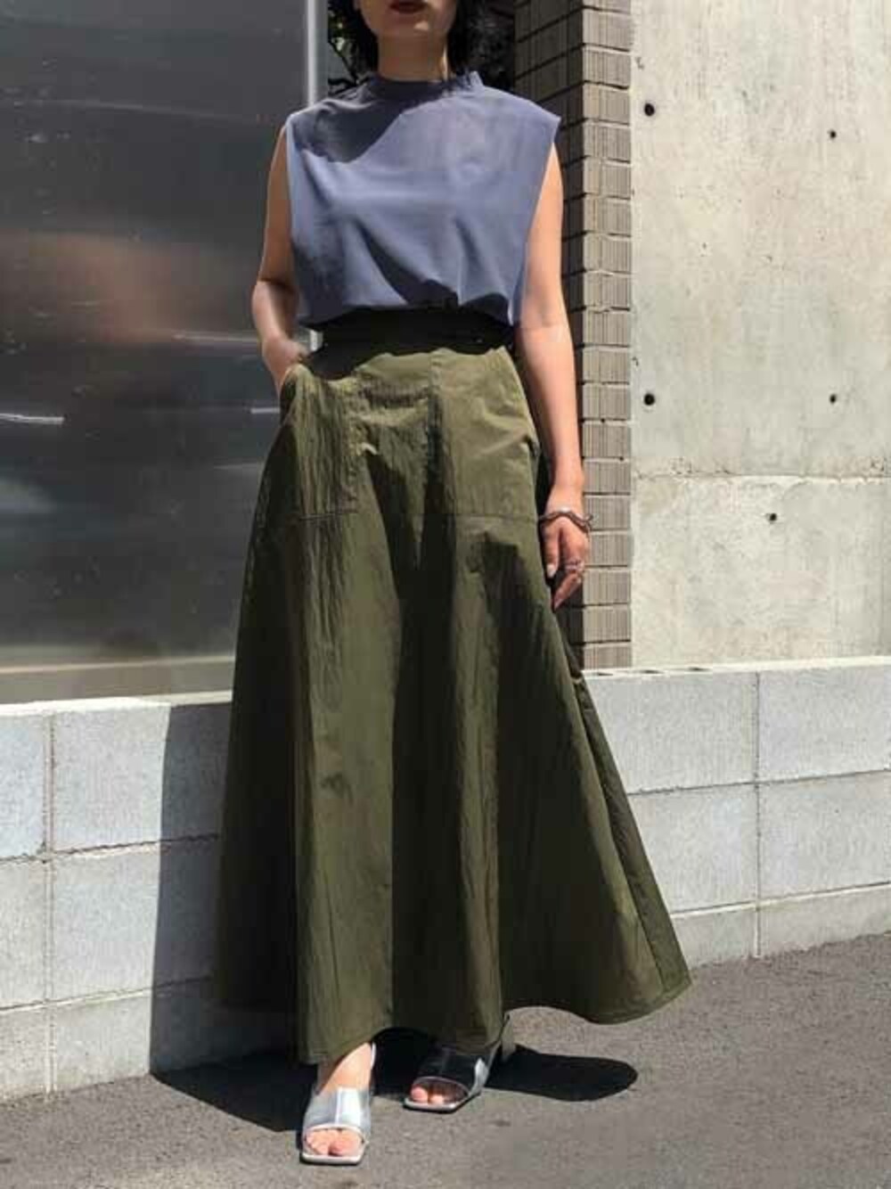 ショルダーにタックがあり立体感のある デザインシアートップスに ハリがあり独特な生地感とフレアシルエットが 印象的なスカートを合わせました。