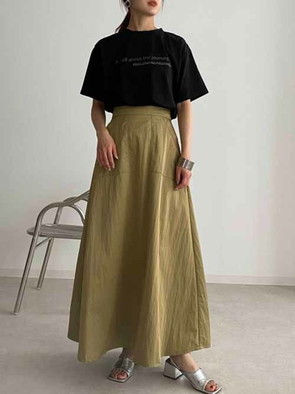 ハリ感がありたっぷりボリュームのあるスカート。 ハイウエストになっている為スタイルアップ効果も〇 スカートにボリュームはあるので、トップスはシンプルに ロゴTをプラス。