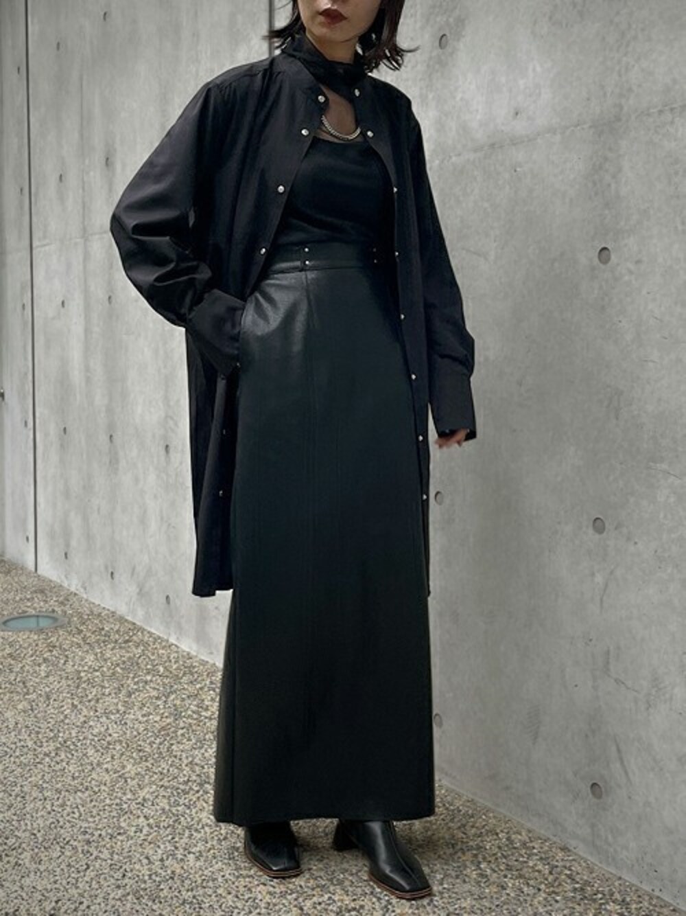 リラックス感のあるルーズシャツは 1枚で着ても羽織りとしても使える万能アイテムです。 レザーのタイトスカートは秋冬一枚持っていると コーディネートの幅が広がります〇