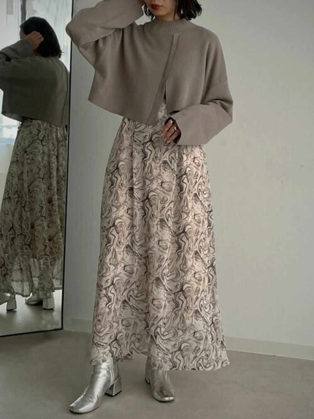 ヴィンテージライクなマーブル柄ワンピース 程よいシアー素材とマーブル柄が軽やかな表情に。 ケープニット合わせてレイヤードスタイルに〇