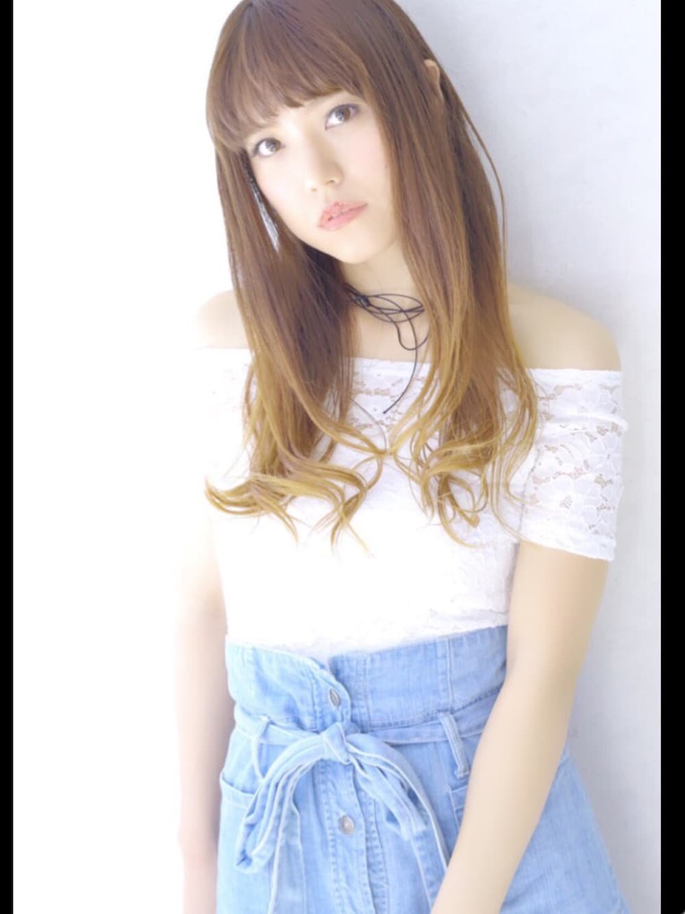レースのオフショルトップスにハイウエストデニムスカートを合わせたコーデ ハイウエストスカートなので、脚長効果もあります👣