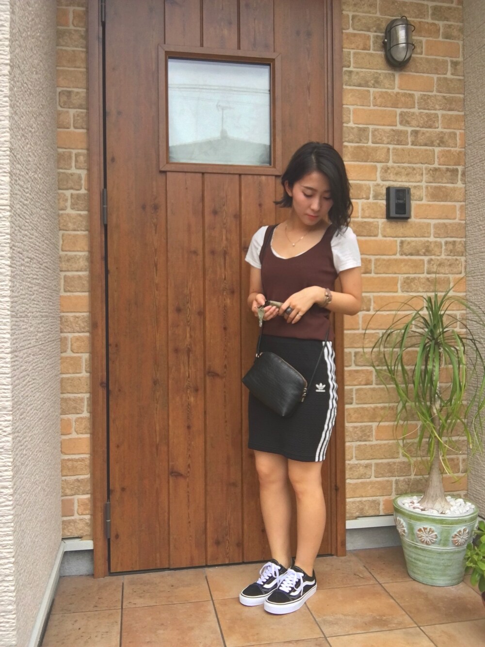 スポーティーな日👟 サマーニットのタンクトップはバックスタイルも可愛いです😍もう少し暑くなるとサラッと1枚で着るのもアリですね✌🏻 大好きアディダスと合わせました!!