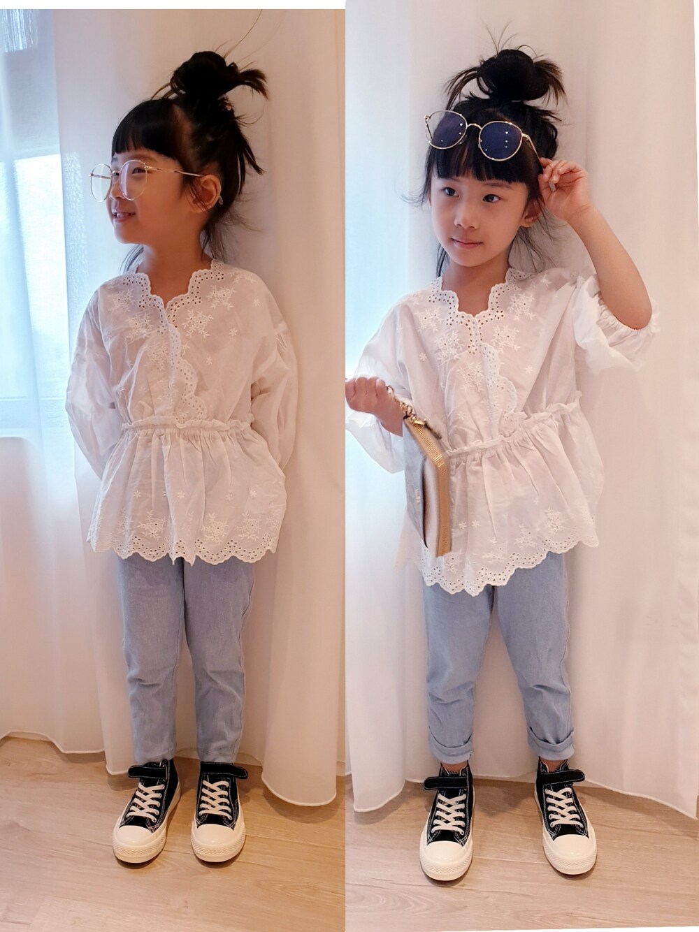 ホワイト系のトップス、ブルー系のデニムパンツを着用したキッズの夏コーディネートの1枚目の写真