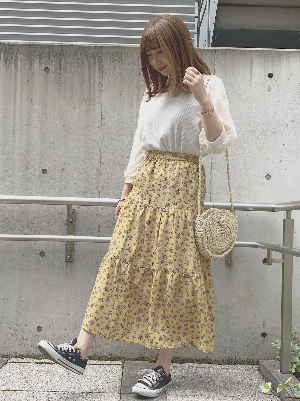 イエロースカートで爽やかに♡ロングスカートもワンショルでバランスよく😻