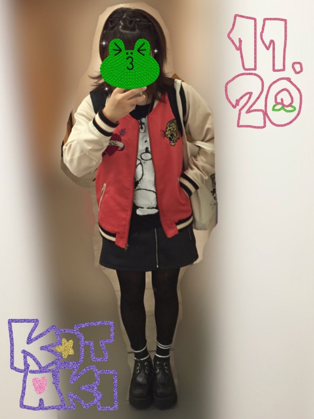 ウォッチ いいね ありがとうございます🍥 11/20のコーデ👚 お気に入りのブルゾンによだれベアーのTシャツとライダーススカートを合わせました🐯💖 よだれベアーTのバックに羽根がプリントされてて、アンジュルムにぴったりじゃ〜!ってなってこのTシャツを中心にコーデ👼👍 この日はアンジュルムライブツアーin福岡でした🎤 アンジュルムでは2回目の福岡遠征✌️ 今回もほんとに楽しかった〜〜! ももにゃ優しいしかわいいし大スキ😭💖 この日の髪型も載せます🌝
