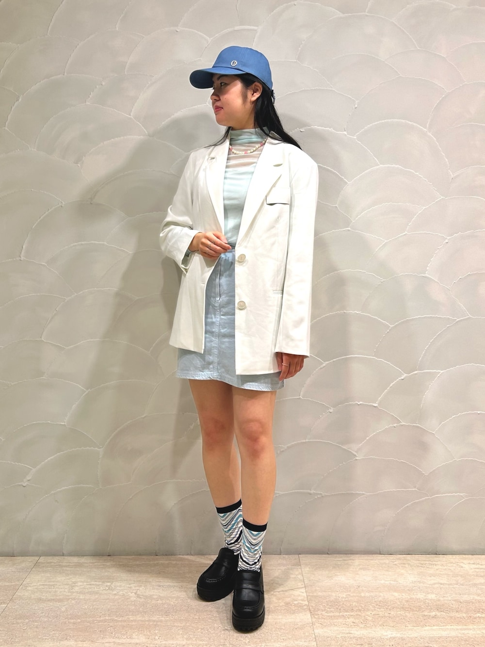 こんにちは☀️ ご覧いただきありがとうございます😊 ホワイトジャケットとデニムミニスカートにキャップを合わせました🐰🎀 𝐼𝑛𝑠𝑡𝑎𝑔𝑟𝑎𝑚→@or_shiiichan
