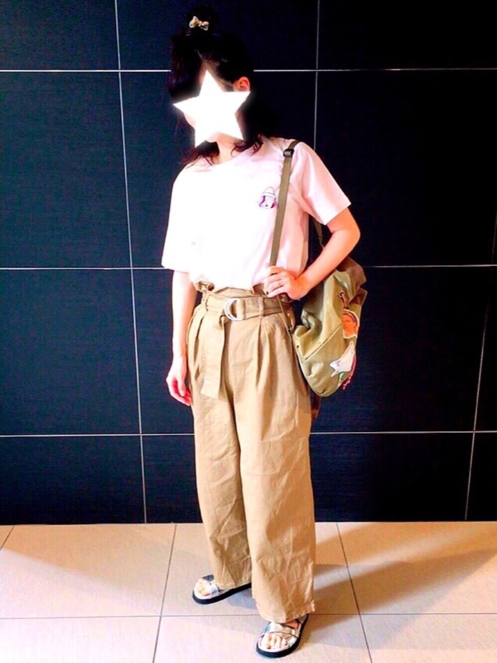 本日のコーデ。 ピンクが大好き^ ^ 雑貨屋さんで一目惚れしたTシャツにGUのワイドパンツを合わせました。 キャセリーニのMA-1風リュックがPOPで可愛い♡♡