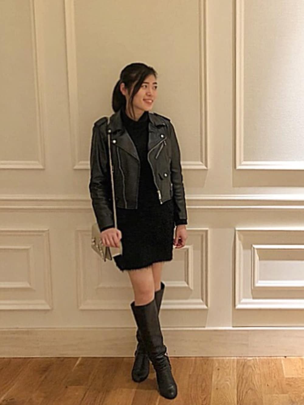 ブラック系のライダースジャケットを着用したレディースの秋コーディネートの1枚目の写真