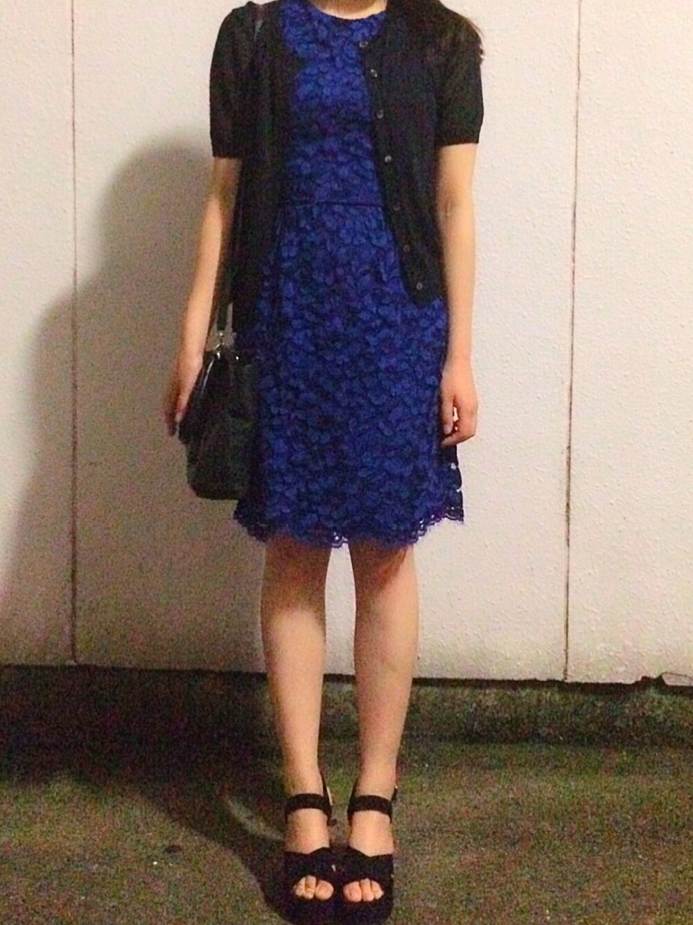 ブルー系のワンピース、ブラック系のカーディガン/ボレロ、ブラック系のショルダーバッグを着用したレディースの夏コーディネートの1枚目の写真