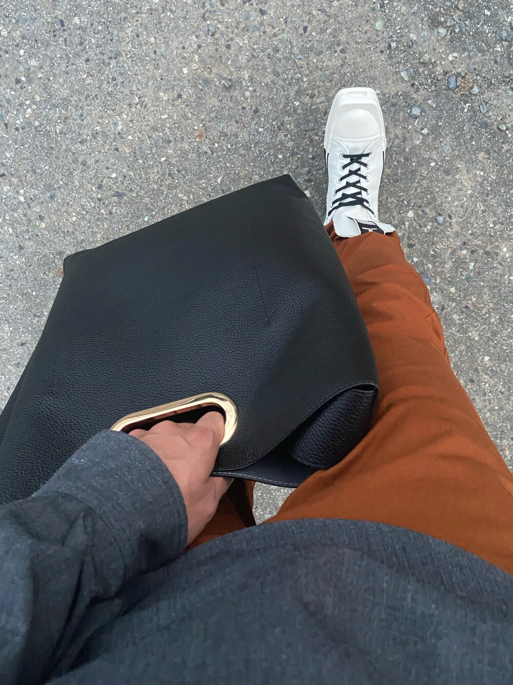 Rick OWENS DRKSHDW × CONVERSE のスニーカー とてもお気に入り。 昨年買って裾上げせず、眠っていたスキニーチノがあったのであえてクッションを付けて履いてみました。 シルエットが少し崩れて、チノ&スニーカーとカジュアル寄りな為、レザーのバッグを追加しました。 ゴールドの金具がほんと良い