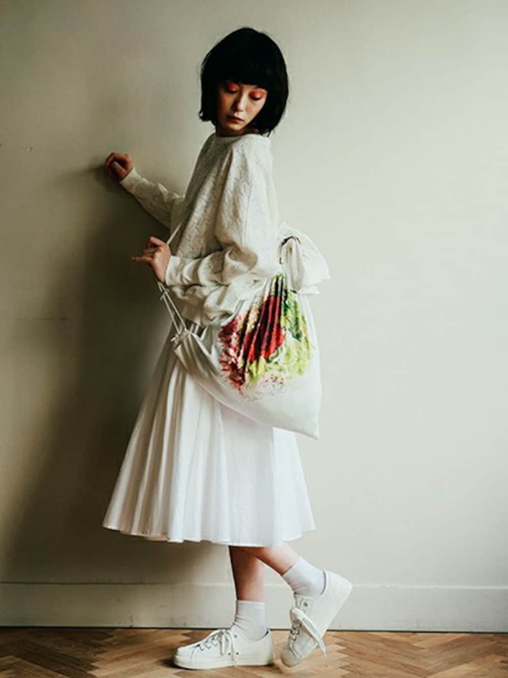 anlioが提案する女の子らしいロマンティクスタイル。 繊細なレースづかいのドルマンスリーブのトップス。 ボリューム感のあるフレアスカートをあわせて。 まるで花束を持ったようなデザインのバッグでアクセントを加えました。 anlio 土田華歩