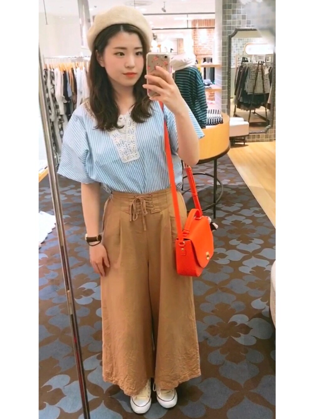 ZARAの水色ボーダートップス👏 首元の刺繍が可愛い p(^_^)q ワイドパンツの裾シワシワは スルーお願いします (笑) (アイロンかけるの面倒だった) バックは迷って迷って 派手色をチョイス ☺︎