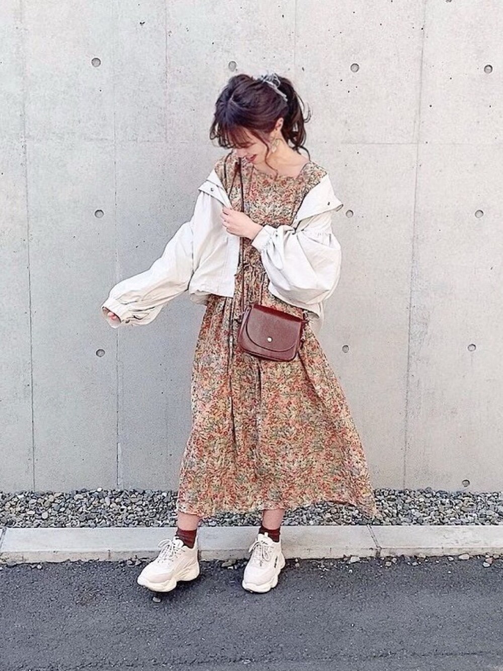 前に、お友達とカフェ行ったときのコーデ🐰 レトロ花柄ワンピこの春おすすめです💓