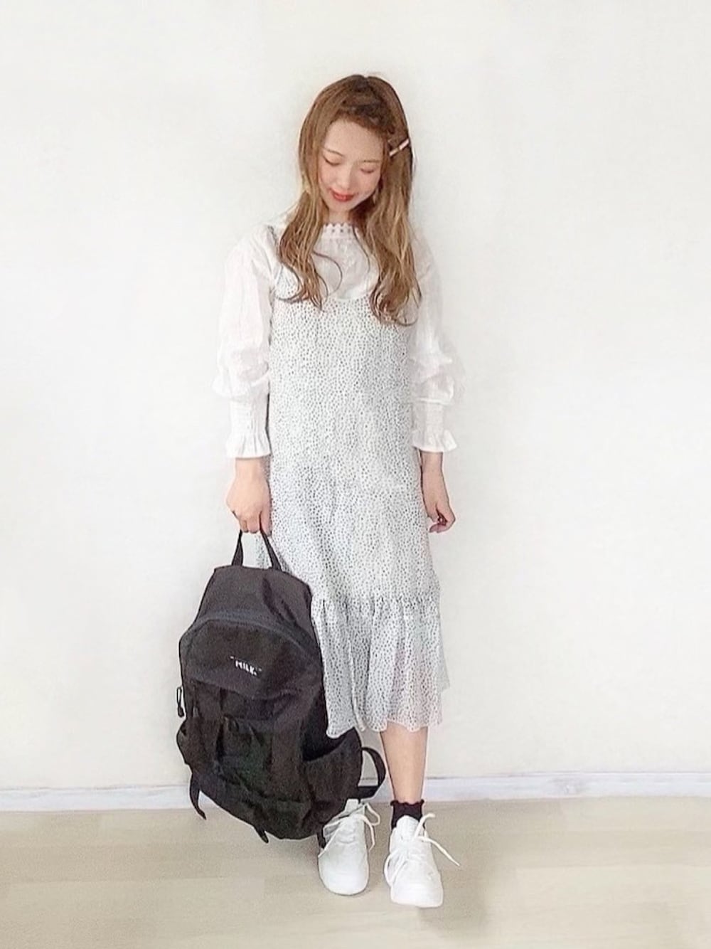 ドット柄フレアキャミワンピでホワイトコーデ🐰♡ ドット柄とかダルメシアン柄 可愛くてカジュアル感も出るから 結構すき..🥺💓