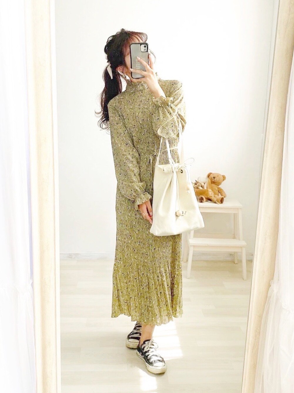 anchanのワンピース「フリルネック小花柄プリーツワンピース」を使ったコーディネート