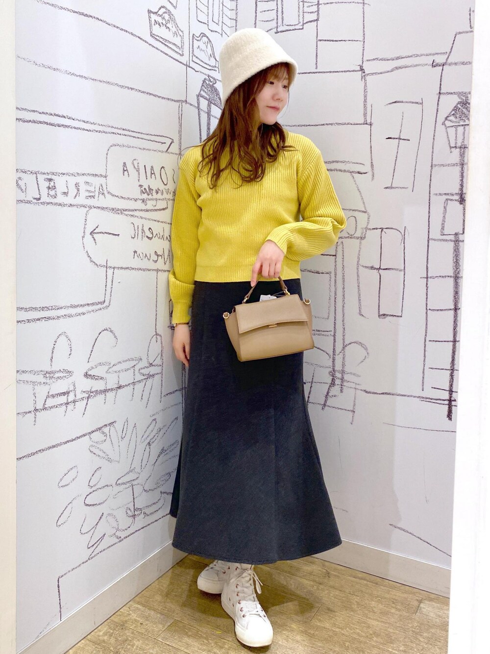 春カラーを取り入れたニットコーデです。起毛が少ないので春にも着やすいです。 スカートは店舗限定アイテム(gdc73430)です。