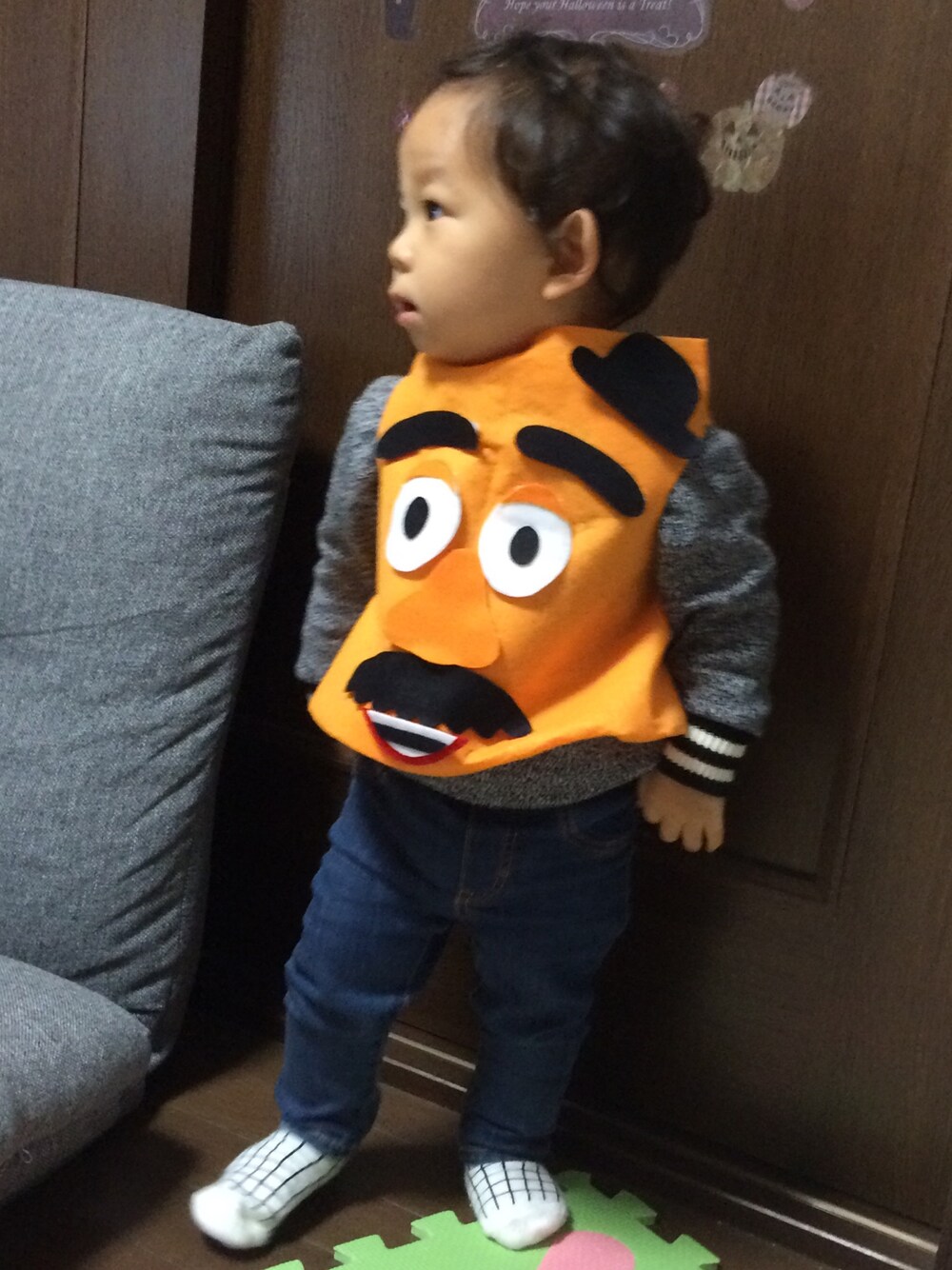 ハローウィンの仮装みてたら 作りたくなって やってしまいました♡ Mr.ポテトヘッド(⸝ᵕᴗᵕ⸝⸝)♡ セリアで隅に追いやられていた ハローウィンマントを改造♬ 下にワイヤーを入れて 後ろはスナップボタンをつけて なんとなく服に見立てました‼︎ パーツはマジックテープにして 顔変えれるようにしました‼︎笑 首の部分切るの忘れた〜!!!笑 セリア様々♡