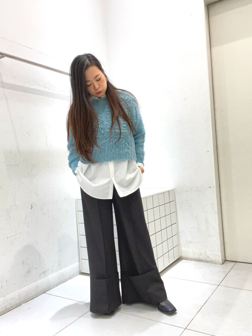 スラックスとシャツでかっこよさを出しつつ、シャギーニットで可愛さをプラスしました!