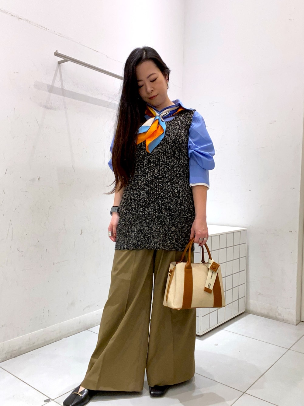 プライベートでもお仕事でも着ていけるコーデ。 色を統一し、スカーフやバッグでオシャレに、こなれ感を。