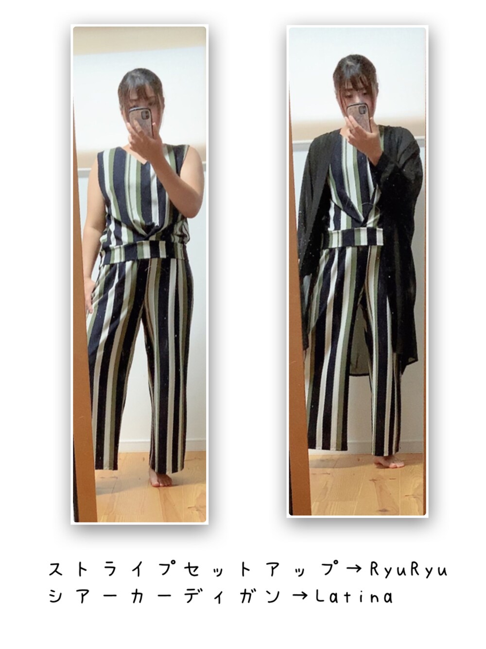 RyuRyuのストライプセットアップ+Latinaのシアーカーディガンでシンプル&クールに😎✨
