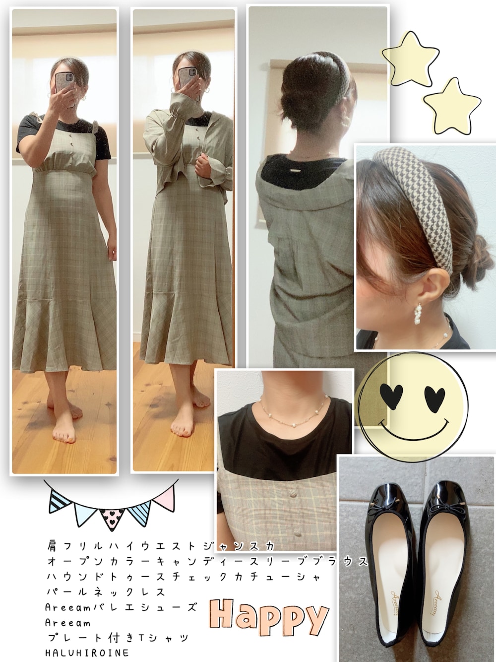 もうすっかり秋ですが、暑がりさんは脱げるコーデが有難い気温🍁🍂 チェック柄で秋らしく☺️ 背中のプレートが見えて可愛い💕💕 🍁肩フリルハイウエストジャンスカ 🍁オープンカラーキャンディースリーブブラウス 🍁ハウンドトゥースチェックカチューシャ 🍁パールネックレス 🍁Areeamバレエシューズ Areeam 🍁プレート付きTシャツ HALUHIROINE