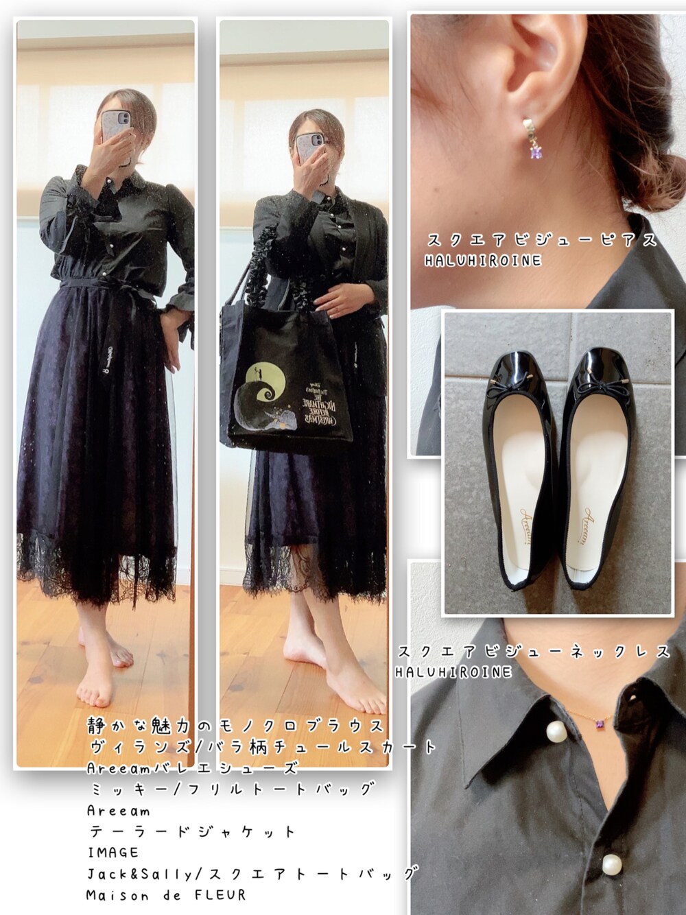 マレフィセントコーデ長袖シャツバージョン💜🖤パープルのアクセサリーがささやかに光る✨️ 💜静かな魅力のモノクロブラウス 🖤ヴィランズ/バラ柄チュールスカート 💜Areeamバレエシューズ 🖤ミッキー/フリルトートバッグ Areeam 💜テーラードジャケット IMAGE 🖤Jack&Sally/スクエアトートバッグ Maison de FLEUR 💜スクエアビジューピアス 🖤スクエアビジューネックレス HALUHIROINE