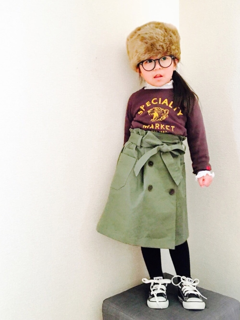 いつも見て頂いてありがとうございます♡ GUのトレンチスカートのカーキバージョン。 今度はちょっとカジュアルに。 皆さん同様、フリルネックにどハマり中(//∇//) プティのレーストップスも持ってるのに、 かわい子ちゃん達が着てたキャサリンコテージのが タイムセールだったので思わずポチ! こちらの方がハイネックでより目立ちます。 すっごく欲しかったパイロットキャップは 完全に買い逃しちゃったので、 スリコのロシアンで代用中〜(◞‸◟) 身長98cm スウェット: 100サイズ トップス: 120サイズ スカート: 110サイズ