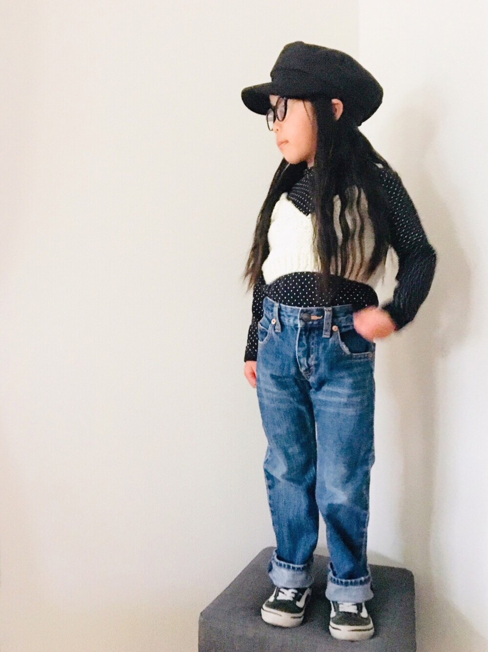 いつも見て頂いてありがとうございます♡ everclosetさんのドット柄トップスを着用させて頂いてます(〃ω〃) 伸縮性抜群で着心地良さそう! モノトーン×デニムでちょっと辛口コーデ(^з^)-☆ 身長104cm トップス: 110サイズ着用