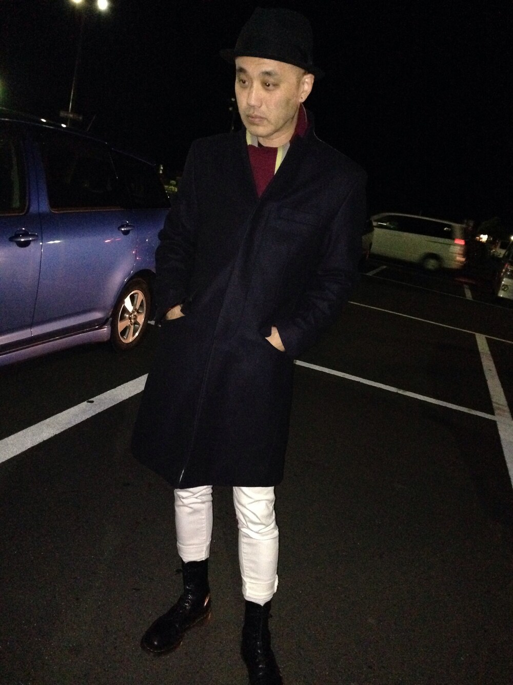 又スタイルがかわってしまったのだ! ハット:ドラゴンハット スクールマフラー:古着 チェスターコート:メルク(中古) パンツ:UNIQLO 10ホール:マーチン