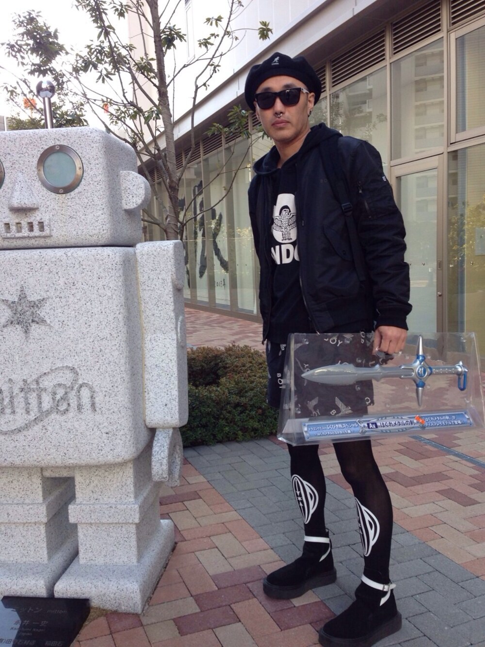 賢者になりました! ドラクエの600円くじでA賞が当たった!記念に写真を撮った! キャスケット:カンゴール サングラス:某アパレル スウェットパーカー:BOYLONDON MA-1:BOYLONDON 海水パンツ:BOYLONDON タイツ:VIVIVAGINA ジョドファータイプのラバーソール:ハリスブラウン