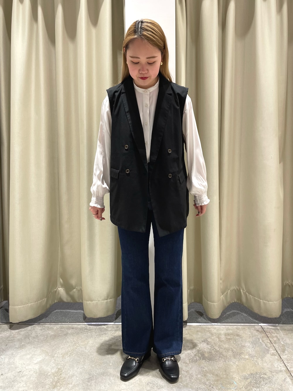 着用サイズ トップス Lsize パンツ Msize 着用感 ブラウスは柔らかく滑らかな生地感なので着心地がとても良いです!袖のギャザーデザインが可愛いです(^^) シンプルなカットソーやブラウスの上にジレを羽織るとコーデが引き締まります!上に羽織るだけでオシャレに見えるので1つ持っておくと◎ 新作のローファーは柔らかくてとても履きやすいです! ぜひチェックしてみて下さい!