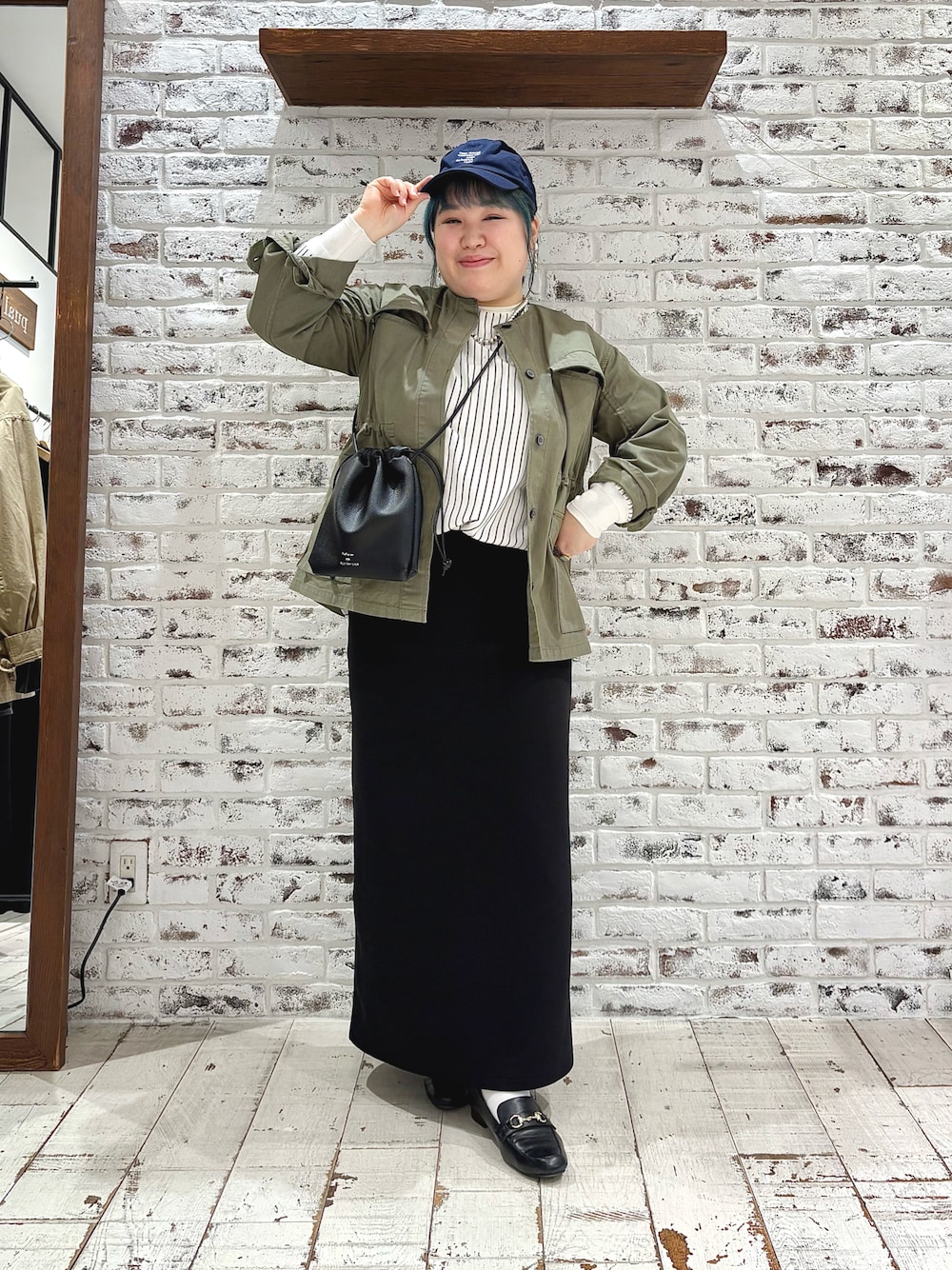 ミリタリージャケット&黒スカートで 大人が挑戦しやすい、カジュアル度控えめコーデ☺️ ミリタリージャケットは程良いサイズ感と ノーカラーデザインで ぽっちゃりで胸が大きい私でも巨大化しなかったです🙆♀️💚 ビックリするくらい細見えする黒のナロースカートと 足元をローファーで合わせる 大人の少しカジュアル度控えめコーデです✨