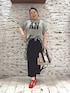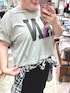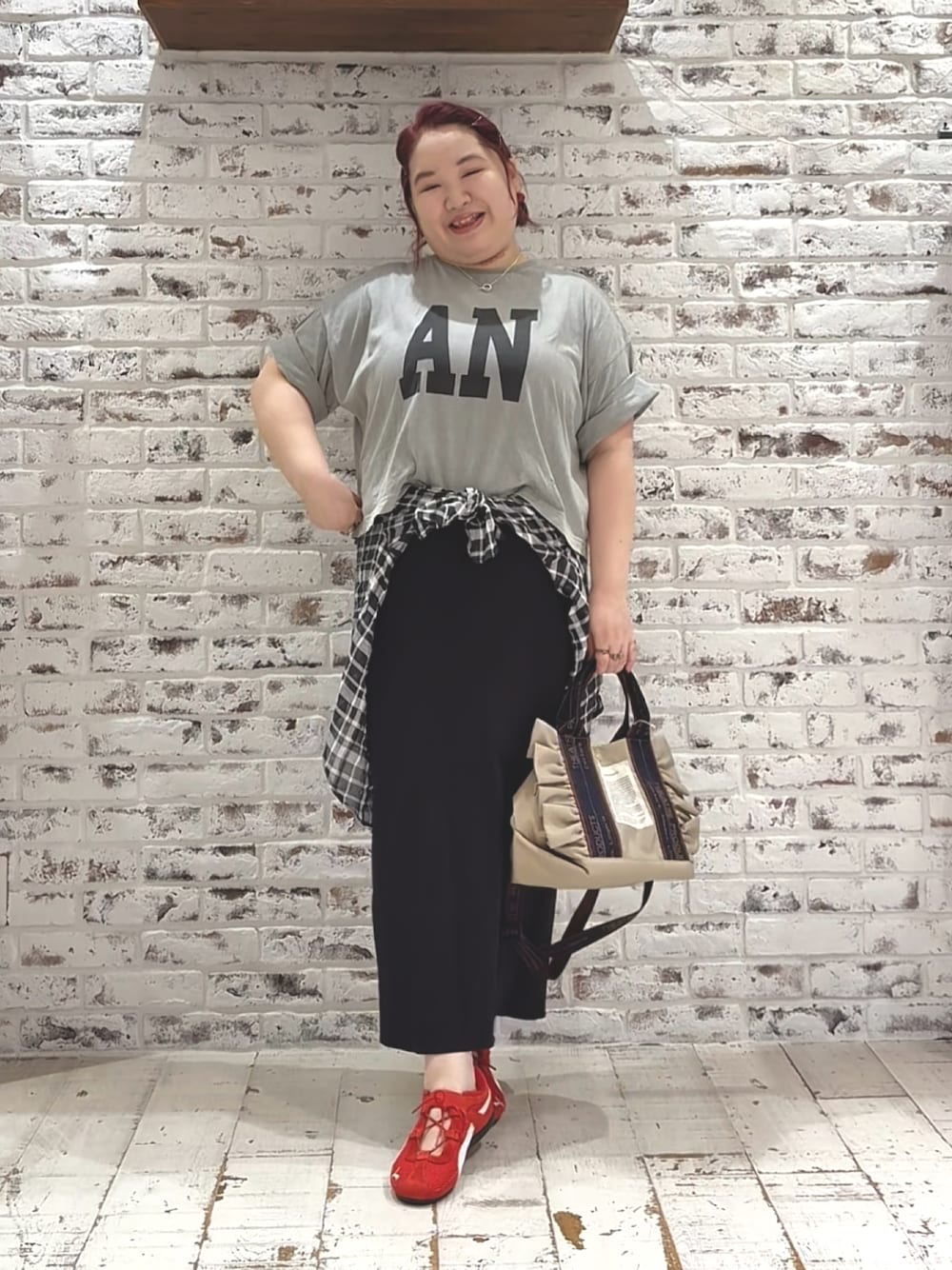 大きなロゴがキャッチーなスーピマコットンTシャツは 好き過ぎて2色買いしてしまいました✨ ちょっとツルッとした着心地の良いコットン100% 絶妙な着丈でインしなくても決まるデザインが お気に入りポイントです☺️ −3㎏見えのナロースカートのブラックは細見え効果抜群ですよ🙆♀️ ウエストゴムでとっても履きやすいのに 身体のラインを拾い過ぎなくて◎ 涼しいニット素材なので暑い今の時期から秋まで長ーく使えますよ🙌 チェックシャツは腰巻きしてお腹周りをカバー 長袖で冷房避け&日除けにも使えて シワ加工なので管理も楽ちんですよ✨