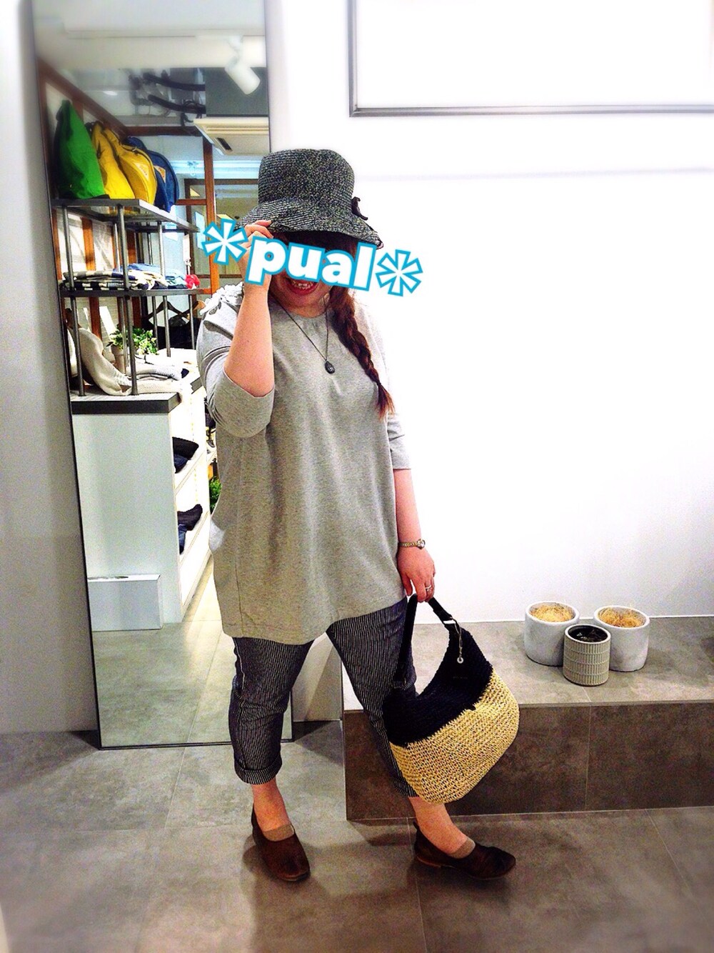 肩にお花レースが付いたチュニックとストライプパンツのコーデ シンプルな色使いで大人カジュアルに挑戦してみました(^.^)✨ パンツがとっても楽ちんで、お気に入りです♡